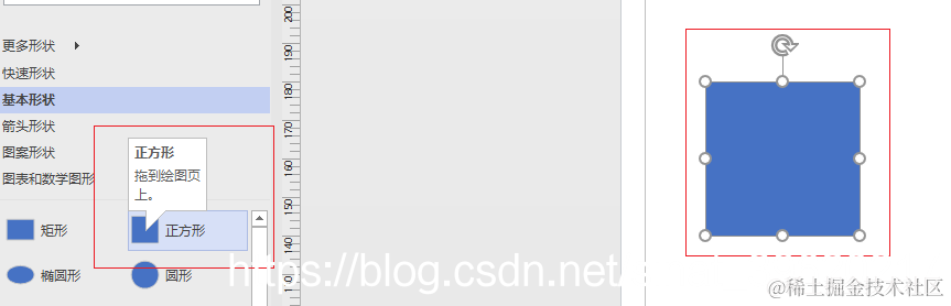 2.从左侧形状窗口中基本形状中选中正方形拖动到绘图页面中,按住形状上的空心圆圈将正方形调小一些。