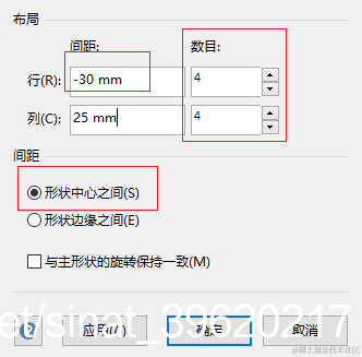 4.将行间距的数值加上负号,表示行向下排列。设置行和列的数目,间距类型选择形状中心之间,即两个形状中心的间距是我们设置的数值,这个数值正好是正方形的边长,则排列后正方形是正好连接在一起的。
