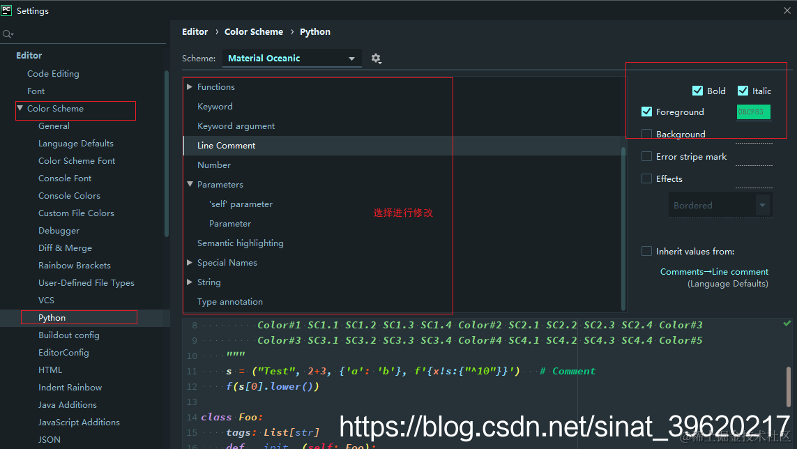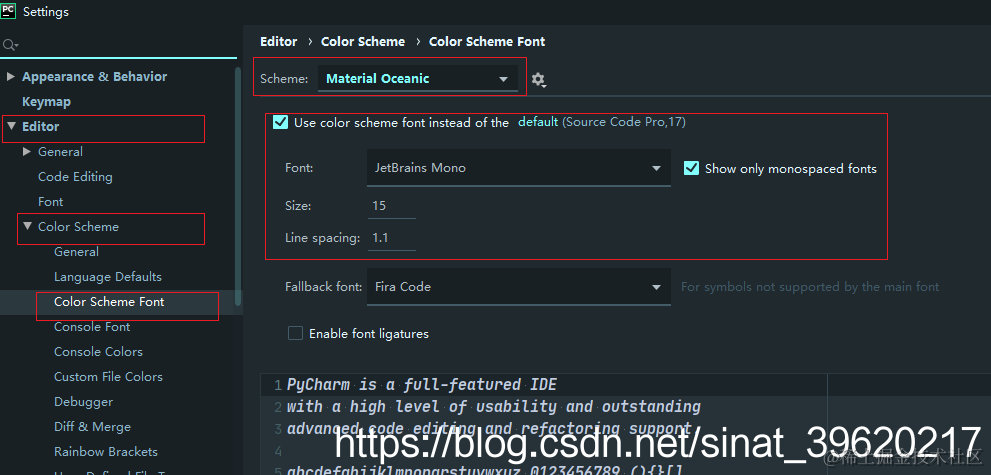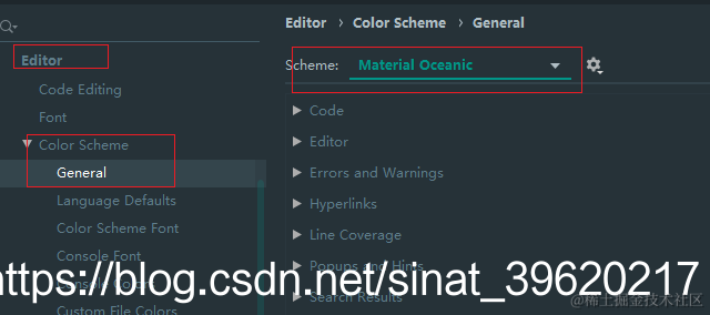 :File -> Settings -> Editor -> Color Scheme Font -> General, scheme选择Oceanic,应用。