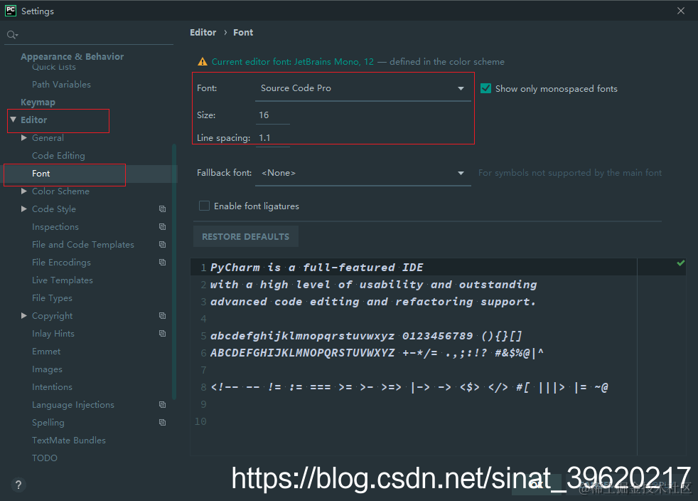 这里我配置的字体是这样的参数:主要字体——Source Code Pro;大小——15;行间距——1.1。