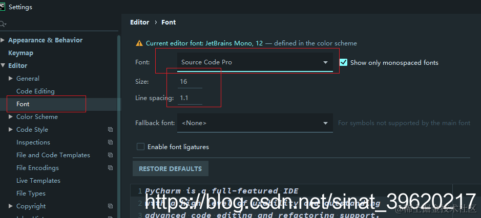 :File -> Settings -> Editor -> Font, Font: Source Code Pro,Size: 16, line-spacing: 1.0,应用。个人觉得这个设置比较舒服