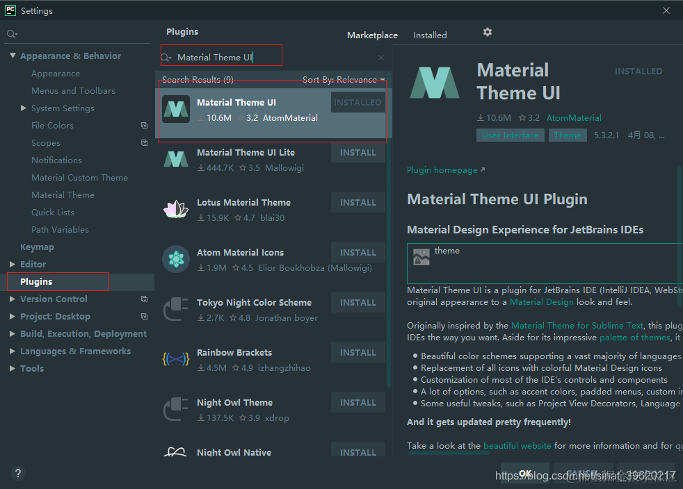 File -> Settings -> Plugins插件,搜索Material Theme UI 安装。