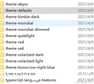 首先进入安装vscode目录找到想要修改调整的主题,以我的文件路径为例:H:\VScode\Microsoft VS Code\resources\app\extensions,主题配置文件都位于resources/app/extensions目录中,以theme-开头的目录即为颜色主题配置: