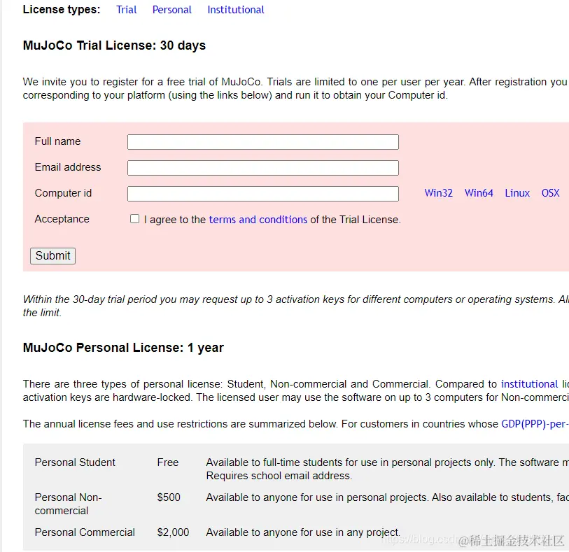 - 进入官网www.mujoco.org/index.html,点击License栏界面如下: