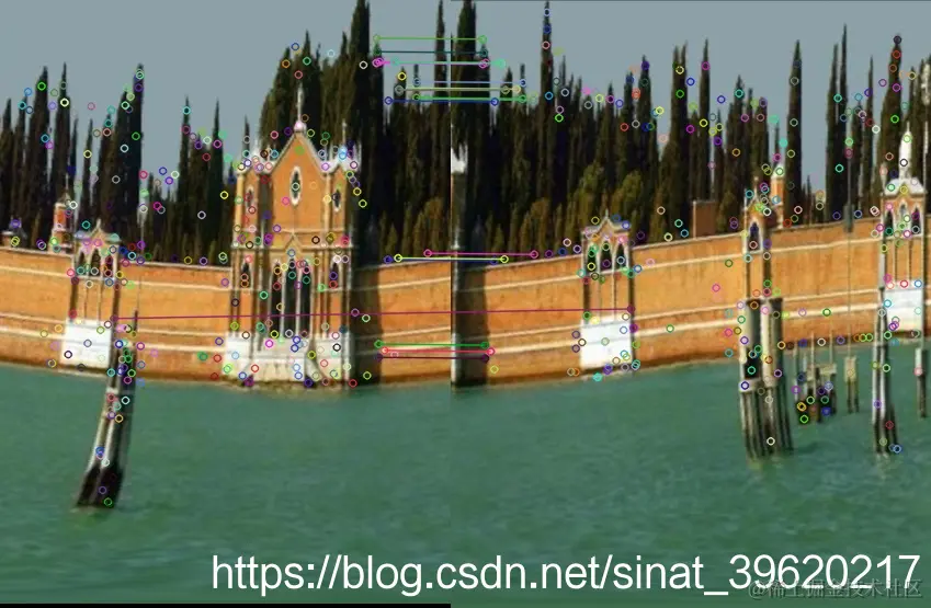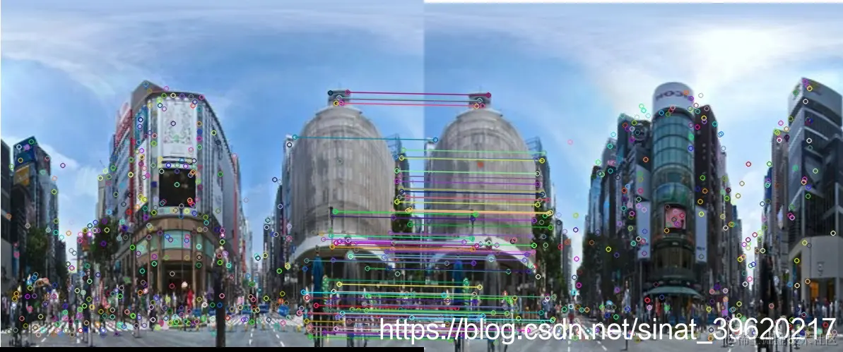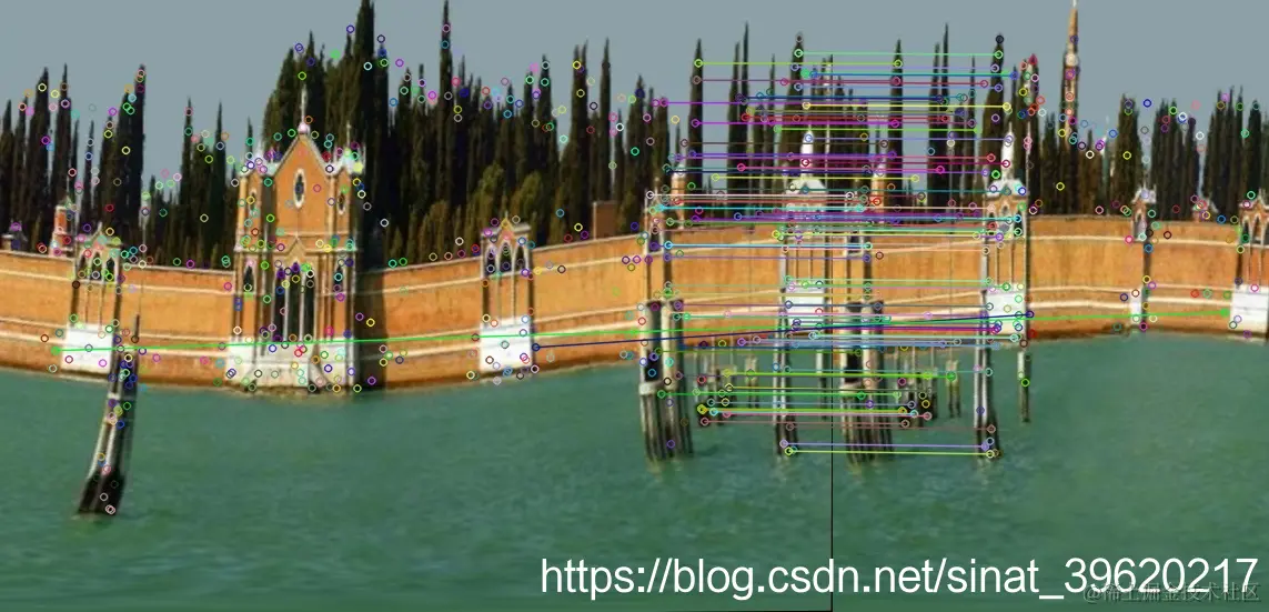 为了排除因为图像遮挡和背景混乱而产生的无匹配关系的关键点,SIFT的作者Lowe提出了比较最近邻距离与次近邻距离的SIFT匹配方式:取一幅图像中的一个SIFT关键点,并找出其与另一幅图像中欧式距离最近的前两个关键点,在这两个关键点中,如果最近的距离除以次近的距离得到的比率ratio少于某个阈值T,则接受这一对匹配点。因为对于错误匹配,由于特征空间的高维性,相似的距离可能有大量其他的错误匹配,从而它的ratio值比较高。显然降低这个比例阈值T,SIFT匹配点数目会减少,但更加稳定,反之亦然。