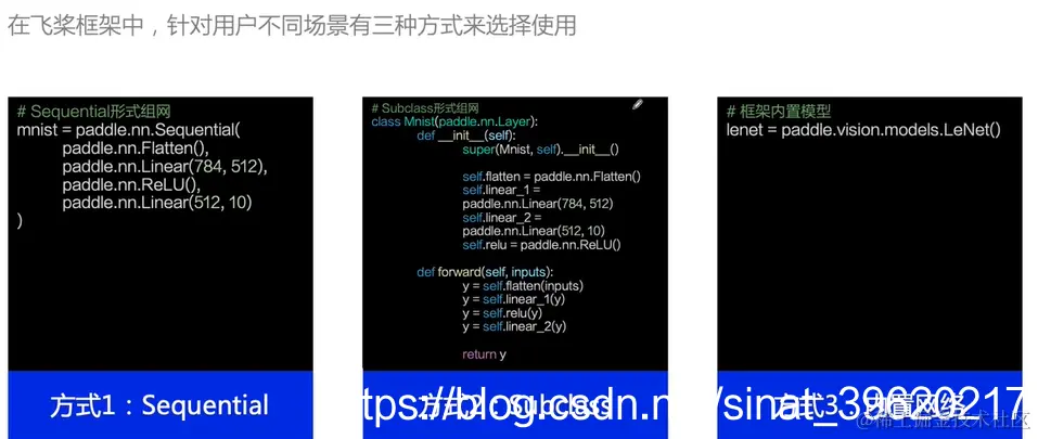 对于组网方式,飞桨框架统一支持 Sequential 或 SubClass 的方式进行模型的组建。我们根据实际的使用场景,来选择最合适的组网方式。如针对顺序的线性网络结构我们可以直接使用 Sequential ,相比于 SubClass ,Sequential 可以快速的完成组网。 如果是一些比较复杂的网络结构,我们可以使用 SubClass 定义的方式来进行模型代码编写,在 init 构造函数中进行 Layer 的声明,在 forward 中使用声明的 Layer 变量进行前向计算。通过这种方式,我们可以组建更灵活的网络结构。
