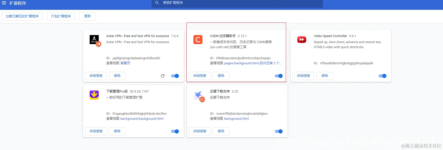 - 打开扩展管理页面 浏览器输入地址“ chrome://extensions/ ”进入扩展程序页面,开启开发者模式