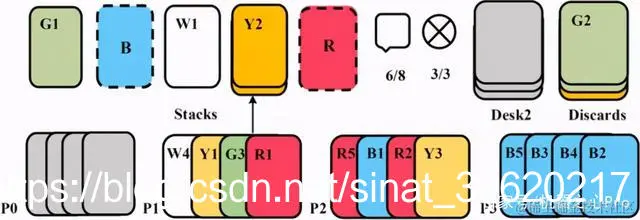 第三个环境是由 Nolan Bard 等人 [3] 在 2019 年提出的一个纯协作任务 Hanabi(源代码:github.com/deepmind/ha… 是一个 turn-based 的纸牌类游戏,也就是每一轮只有一个玩家可以出牌,相较于之前的多智能体任务,Hanabi 的一个重要特点是纯合作,每个玩家需要对其他玩家的意图进行推理,完成协作才能获得分数,Hanabi 的玩家数可以是 2-5 个,图 3 是 4 个玩家的任务示意图,感兴趣的读者可以自己尝试玩一下。