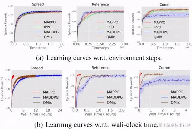 从图 4 可以看出与其他算法相比,MAPPO 不仅具有相当的数据样本效率和性能表现(performance)(图(a)),同时还具有显著高的算法运行效率(图(b))。