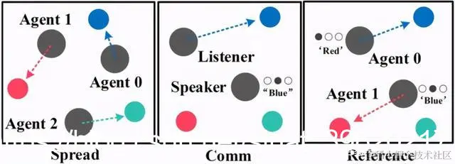 图 1:MPE 环境中的 3 个子任务:Spread,Comm 和 Reference