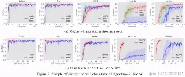 表 1 展示了 MAPPO 与 IPPO,QMix 以及针对 StarCraftII 的开发的 SOTA 算法 RODE 的胜率对比,在截断至 10M 数据的情况下,MAPPO 在 19/23 个地图的胜率都达到了 SOTA,除了 3s5z vs. 3s6z,其他地图与 SOTA 算法的差距小于 5%,而 3s5z vs. 3s6z 在截断至 10M 时并未完全收敛,如果截断至 25M,则可以达到 91% 的胜率。