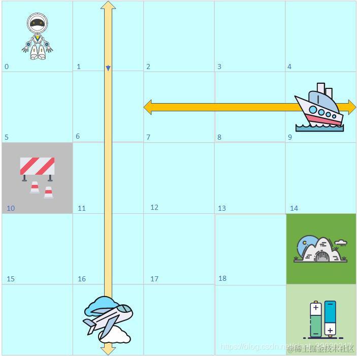 如图所示:初始状态下的环境,机器人在左上角出发,去寻找右下角的电池,静态障碍:分别在10、19位置,动态障碍:有飞机和轮船,箭头表示它们可以移动到的位置,会随时间改变而改变。这里假设:它们的移动速度和机器人一样。飞机会沿着当前列上下来回移动,轮船则只在当前位置到左边两格的范围来回移动。移动范围:如箭头所示。