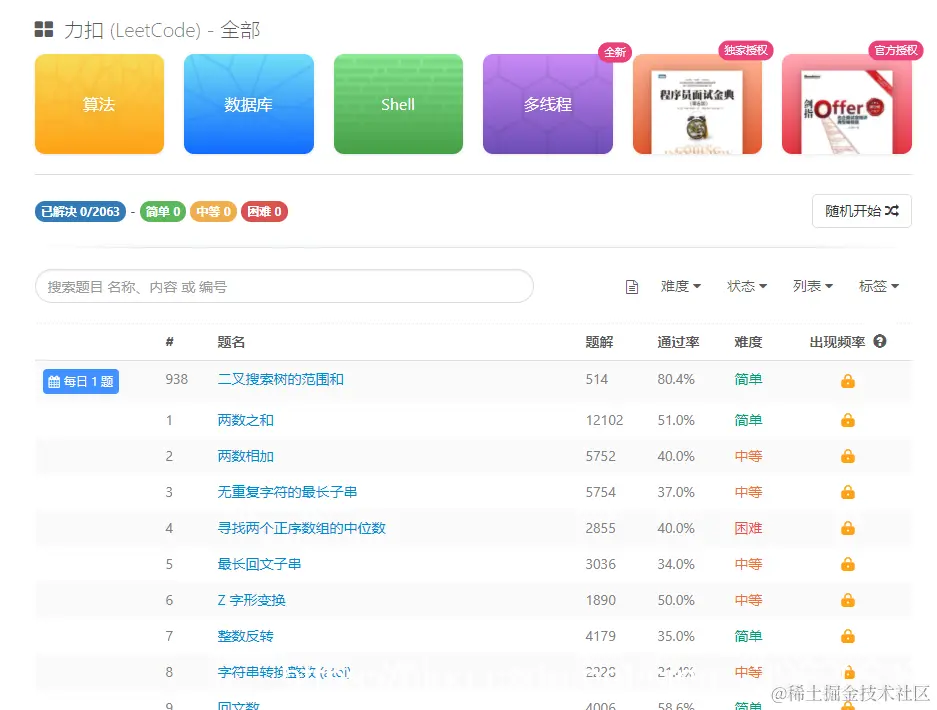 leetcode(力扣)很多国内外的程序员在上面刷题,难度从 Easy、Medium 至 Hard 都有,上面的题型覆盖很广,像线段树、滑动数组、博弈论、扫描线等都应有具有。