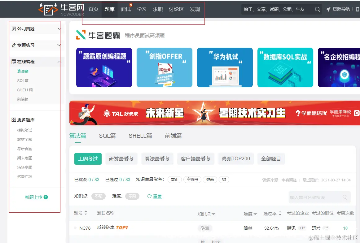 牛客网作为国内内容超级丰富的 IT 题库,题库+面试+学习+求职+讨论 应有尽有,不仅是一个刷题的平台,还是一个交流学习的平台。