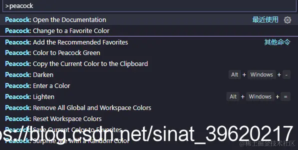 使用快捷键 Ctrl+Shift+P 可以快速调出 Command Palette,输入 "Peacock:"