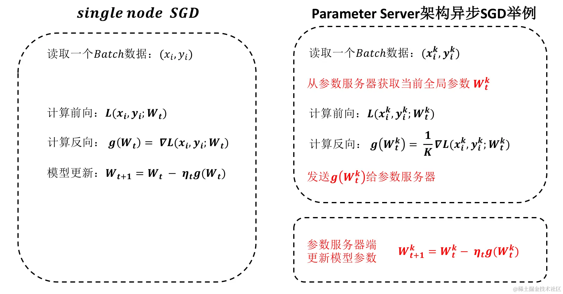 异步并行训练在参数服务器架构下采用较多,其核心思想就是让每个计算节点不用关心其他节点的计算步调,独自与参数服务器完成模型参数的更新。异步并行训练情况下,参数服务器端的模型参数更新也是异步进行,即不需要等待其他正在计算的节点的进度。异步并行训练下,各个计算节点的计算节奏不同,参数服务器更新模型参数的节奏也会不同,这种特性使得模型的收敛可能存在一定的问题,能够保证高效率收敛的异步并行算法是一个算法研究比较多的领域。下图是一个单机SGD与参数服务器架构下的异步SGD的计算步骤对比,可以看到参数服务器一端与同步SGD的区别在于不需要对各个节点的梯度进行汇聚而直接进行模型参数的更新。