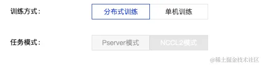 对于PaddleCloud分布式训练,训练方式需要选择“分布式训练”,任务模式需要选择“NCCL2模式”,如下图所示。