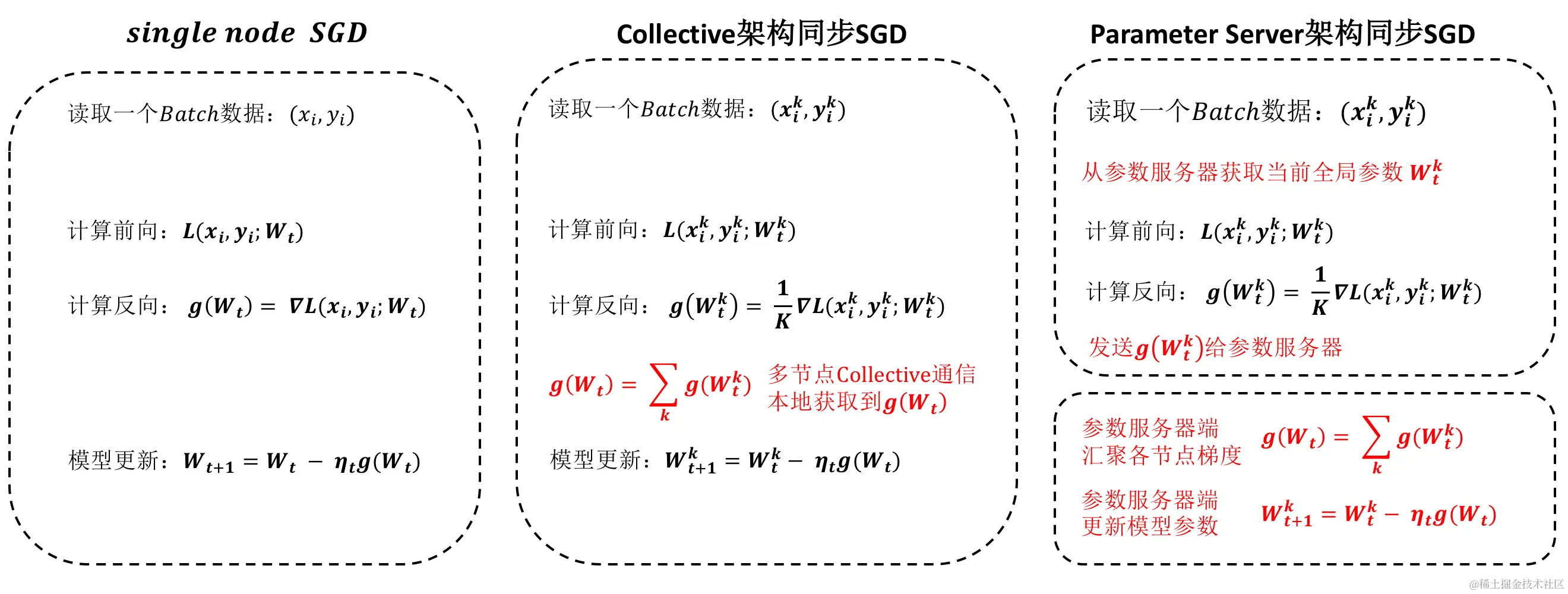 同步并行训练通常是指在每个计算节点在模型训练的每一步都进行一次模型参数的全局更新,更新方式可以采用参数服务器架构,也可以采用Collective架构。同步训练在训练的每一步都会进行参数同步,因此其行为本质上与单机训练一致,只是单步训练的总数据量会更大。值得一提的是,在参数服务器架构下的同步训练,优化算法的执行是发生在参数服务器一端,而在Collective架构下,通过对每一步所有样本产生的模型参数梯度进行全局同步后,每个设备执行优化算法即相当于优化全局的模型参数。下图展示了单机SGD算法,基于Collective架构的同步SGD算法,基于Parameter Server的异步SGD算法在计算步骤上的区别。可以看到Collective的架构发生通信的位置比较集中,并行是通过与正在训练的其他节点进行Collective通信完成,因此Collective架构是一种去中心化架构,每个节点只需要关注自己即可。参数服务器架构在获取参数,推送参数梯度等操作上都需要与参数服务器进行通信,参数服务器架构下的参数服务器端,要等待每个计算节点发送的梯度信息进行汇总后再进行模型参数的更新,因此是一种中心化的模式。