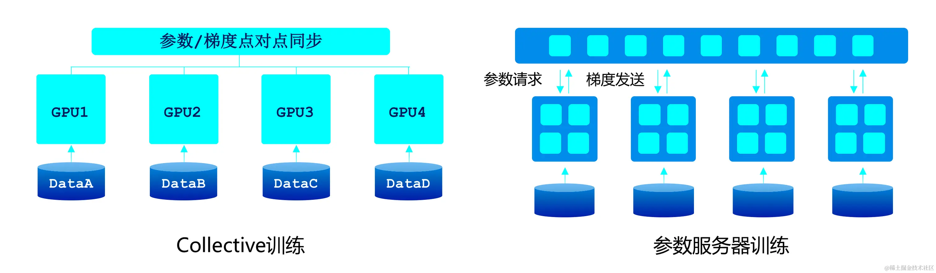下图展示了Collective训练架构和参数服务器训练架构的示意图。