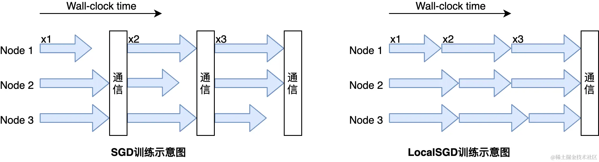 GPU多机多卡同步训练过程中存在慢trainer现象,即每步中训练快的trainer的同步通信需要等待训练慢的trainer。 由于每步中慢trainer的rank具有随机性, 因此我们使用局部异步训练的方式——LocalSGD, 通过多步异步训练(无通信阻塞)实现慢trainer时间均摊, 从而提升同步训练性能,如下图所示:
