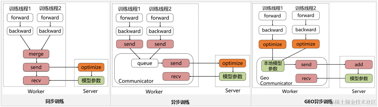 飞桨的参数服务器框架也是基于这种经典的参数服务器模式进行设计和开发的,同时在这基础上进行了SGD(Stochastic Gradient Descent)算法的创新(GEO-SGD)。目前飞桨支持3种模式,分别是同步训练模式、异步训练模式、GEO异步训练模式,三者之间的差异如下图所示。
