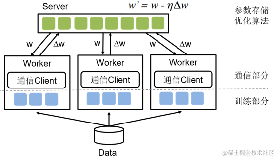- Server端:接收Worker端上传的梯度,根据优化算法更新参数。根据Server端每次参数更新是否需要等待所有Worker端的梯度,分为同步训练和异步训练两种机制。