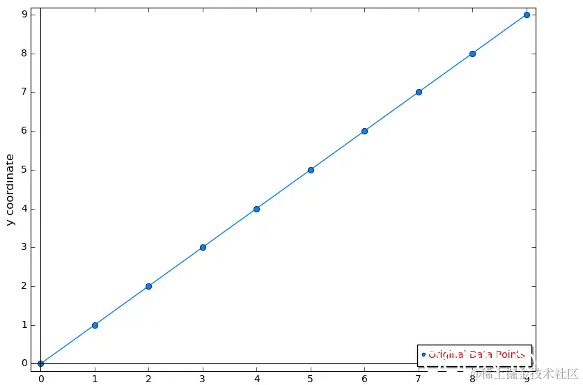 plot1 = list_plot(zip(a,b),plotjoined=True,color=(0,.5,1),marker='o',ticks=[range(10),range(10)],legend_label='Original Data Points',legend_color='red')