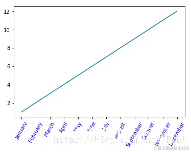 这里添加了 calendar 模块,用于显示月份的名称。calendar.month_name[1:13]即1月份到12月份每个月份的名称的数组。后面的参数color='blue'表示将标签颜色置为蓝色,rotation表示标签逆时针旋转60度。