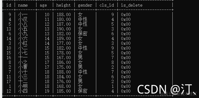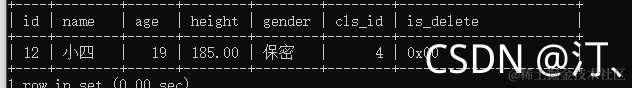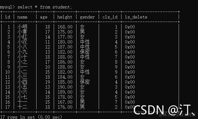 create table student( id int unsigned primary key auto_increment not null, name varchar(20) default '', age tinyint unsigned default 0, height decimal (5,2), gender enum('男', '女', '中性', '保密') default '保密', cls_id int unsigned default 0, is_delete bit default 0 );