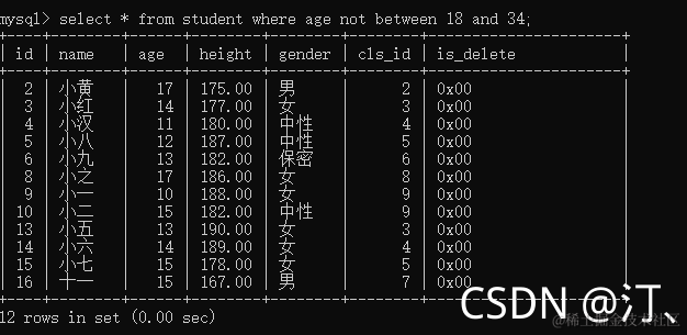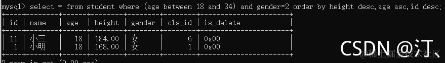 select * from student where (age between 18 and 34) and gender=2 order by height desc,age asc,id desc;