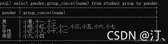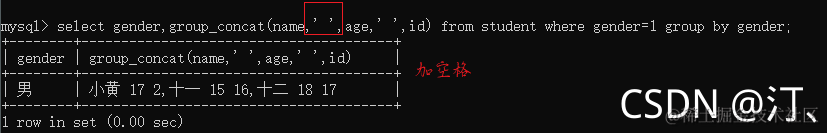 select gender,group_concat(name,' ',age,'',id) from student where gender=1 group by gender;