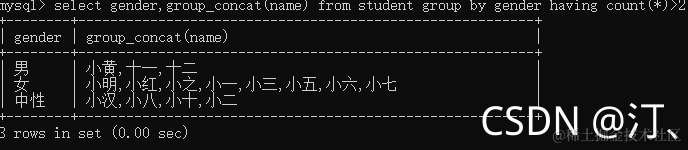 select gender,group_concat(name) from student group by gender having count(*)>2;