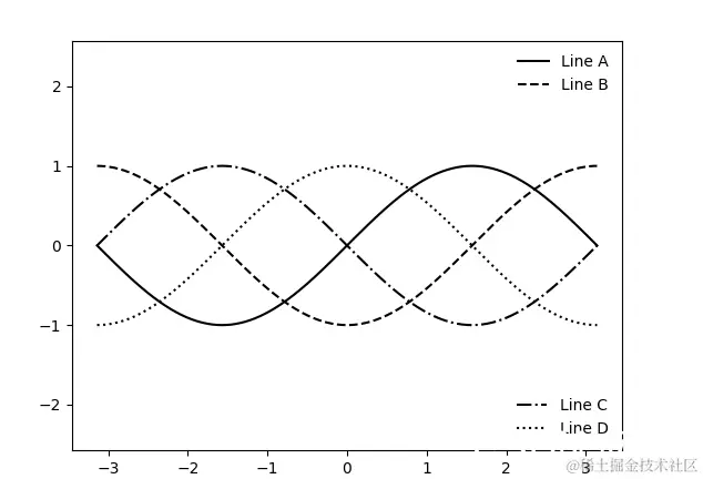 Axes.legend(lines[:2],['Line A','Line B'],loc='uppper right',frameon=False)