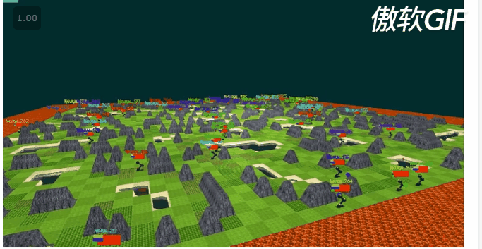 Neural MMOs也是OpenAI开源的一个大型的复杂ma游戏场景,没啥特别的特点,就是大,毕竟是MMO。这张大地图中,由于资源有限,agent要学着合作/竞争活下去,据说科学家们都可以基于此来研究生物进化,种群形成等很多社会性行为的形成过程。由于环境比较大,所以IO甚至都会有点比较大问题,这么多agent的状态的获取等都需要有特殊的方式来进行优化,他们的论文也讲了不少工程方面的事情,中了今年的AAMAS20的短文。Render如下: