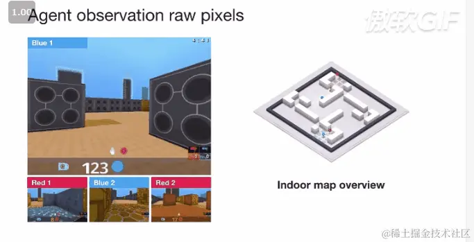 这个环境来自 DeepMind的lab环境arxiv.org/pdf/1612.03…,是其中一张雷神之锤III竞技场(Quake III Arena)的地图。主要是两队,每队由两个agent组成,在室内和户外两个场景下以第一人称视角竞争玩夺旗的游戏。