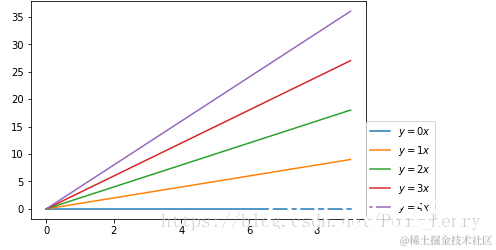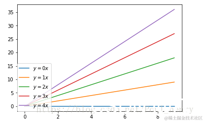 ax.plot(x, i * x, label='$y = %ix$' % i)