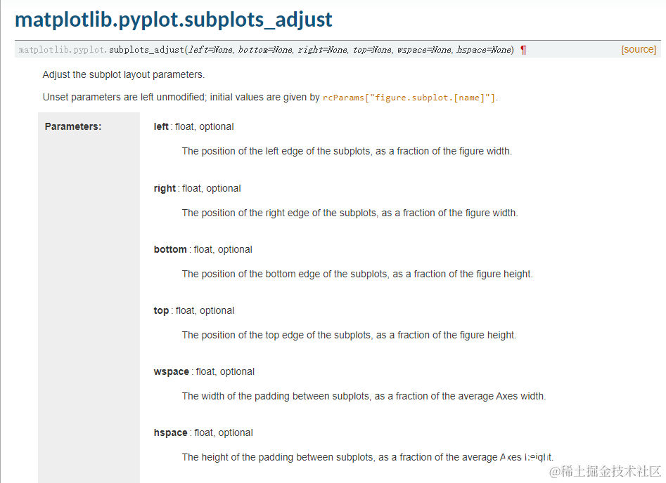 它包含6个参数,其中4个参数left, right, bottom, top的作用是分别调整子图的左部,右部,底部,顶部的位置,另外2个参数wspace, hspace的作用分别是调整子图之间的左右之间距离和上下之间距离。