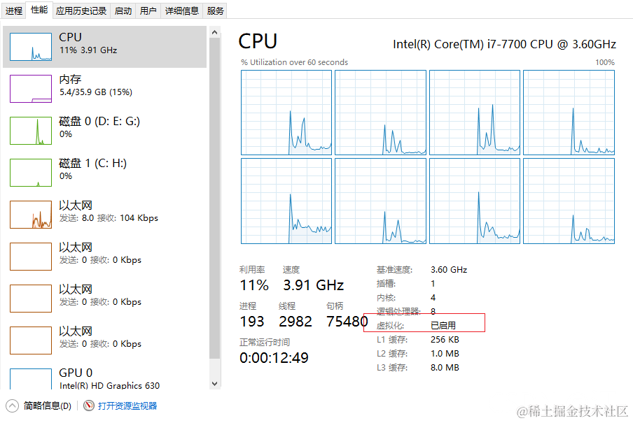- 开启虚拟化重启后,进入任务管理器看虚拟化是否已启用。