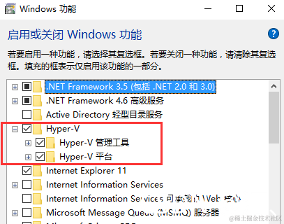 然后再是进入电脑的控制面板->程序->启用或关闭Windows功能->把Hyper-v勾上,启用后电脑会重启,后面就可以下载并安装Docker for Windows了。