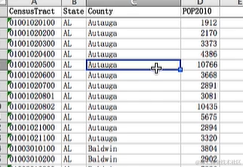 列分别是普查区的编号(A),州的简称(B),县的名称(C),普查区的人口(D)。