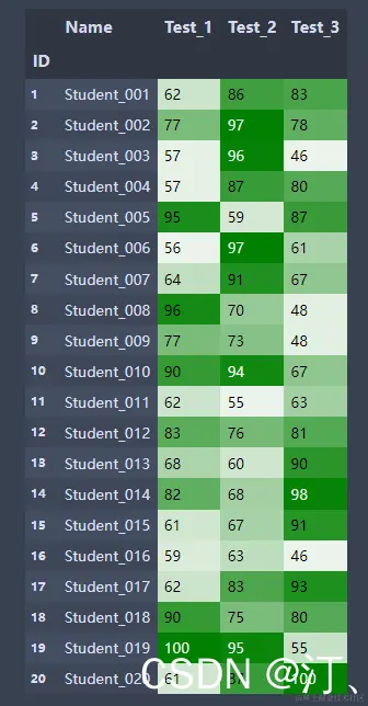students.style.background_gradient(color_map,subset=['Test_1', 'Test_2', 'Test_3']) #subset选择数据区域