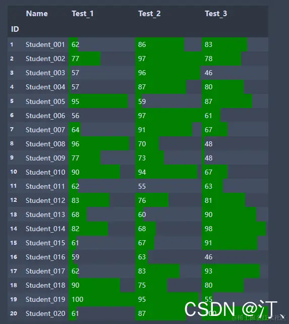 students.style.bar(color="green",subset=['Test_1', 'Test_2', 'Test_3']) #subset选择数据区域