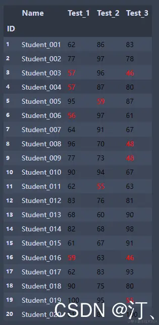 students.style.applymap(low_score_red,subset=['Test_1', 'Test_2', 'Test_3'])