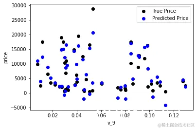 绘制特征v_9的值与标签的散点图,图片发现模型的预测结果(蓝色点)与真实标签(黑色点)的分布差异较大,且部分预测值出现了小于0的情况,说明我们的模型存在一些问题