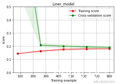 plot_learning_curve(LinearRegression(), 'Liner_model', train_X[:1000], train_y_ln[:1000], ylim=(0.0, 0.5), cv=5, n_jobs=1)