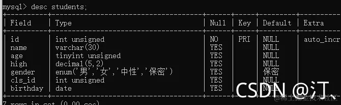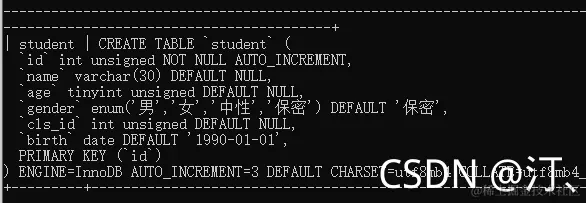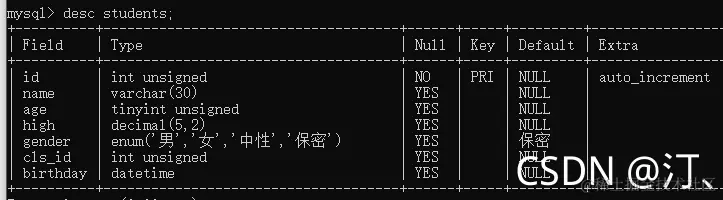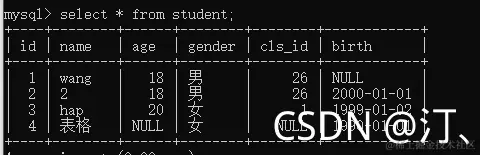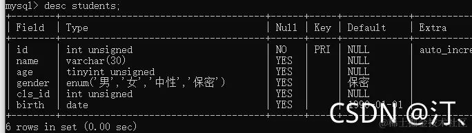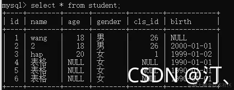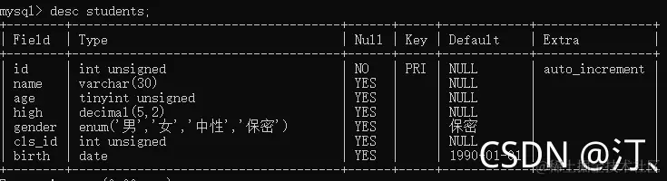加了个默认值修改表students中birthday字段名改为birth且数据类型为date,默认为1990-01-01