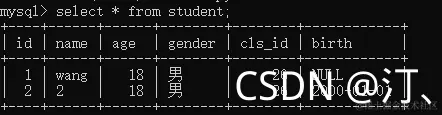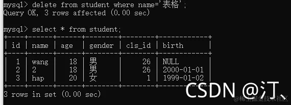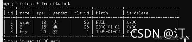 insert into student values(default,'hap',20,'女',1,'1999-01-02'),(default,'jog',12,'男,2,'1552-01-03')