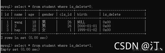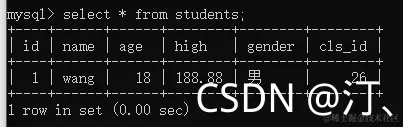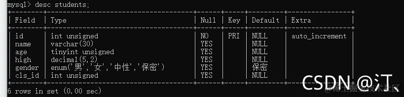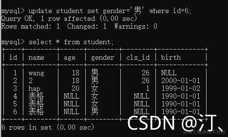 修改id=6的人的性别:update students set gender='男' where id=6;