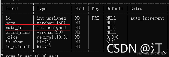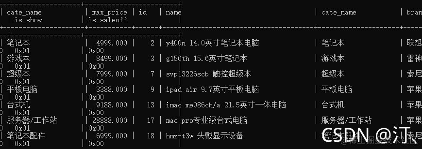 分别表示id,名字,类别名,品牌名,价格,是否显示,是否售罄。