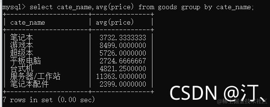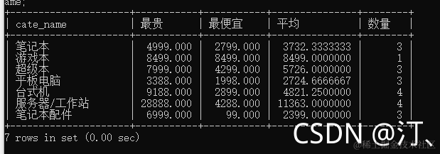 select cate_name,max(price) as 最贵,min(price) as 最便宜,avg(price) as 平均,count(*) as 数量 from goods group by cate_name;